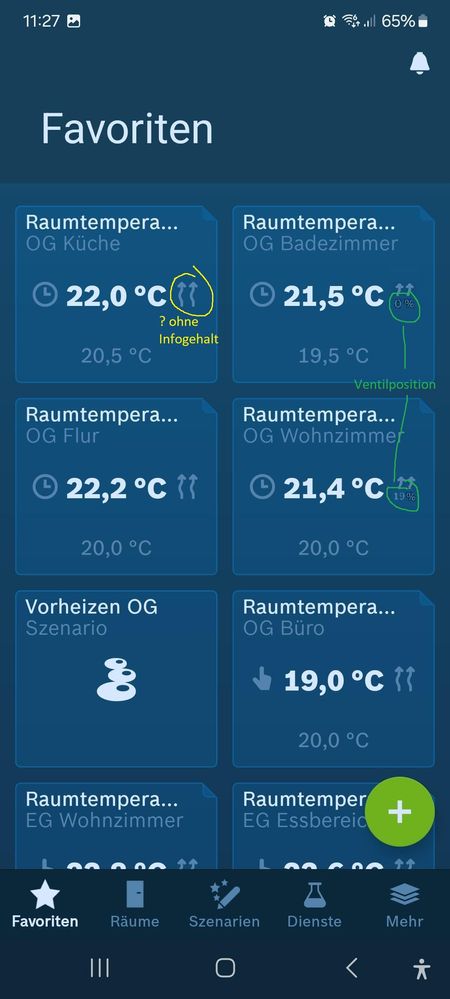 Es sind immer nur zwei Schlangenlinien mit Pfeil nach oben zu sehen, was ich normalerweise so interpretieren würde dass Hochgeheizt wird, was aber nicht sein kann, wenn ein Ventil tatsächlich 0% geöffnet ist.