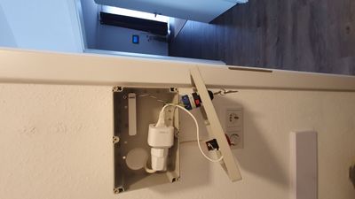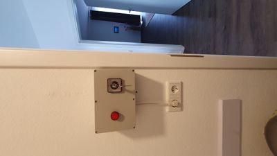 Da wir zwei Haustüren haben, kann das Teil auch beliebig oft dupliziert und installiert werden. Auslöser ist nämlich ein Tür-/Fensterkontakt. Ohne Signalleuchte geht das deutlich kompakter, da der Zwischenstecker, der 230V Anschluss und die Leuchte entfallen können. So sieht es bei uns aus: