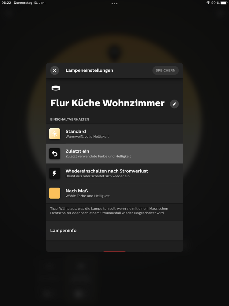 Die Farbe / Farbtemperatur gebe ich dann in der HUE App als default Wert vor.