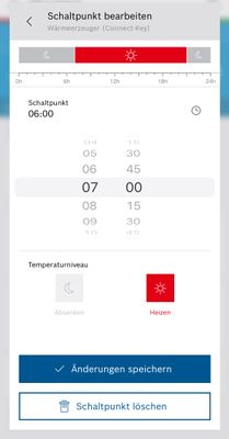 In der HomeCom Easy App kann man ja Zeitpläne fürs Heizen hinterlegen. Wenn ich dort jetzt einen Schaltpunkt bearbeite wird oben links „Schaltpunkt xx:xx“ (wobei xx:xx die eingestellte Uhrzeit minus 1h ist) angezeigt. (hoffe auf dem Bild is das zu erkennen - 7:00 gewählt, oben steht aber 6:00)