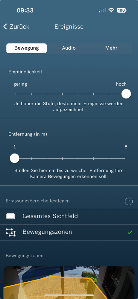 Wir können Bewegungszonen einrichten. Damit ist der Erfassungsbereich der Kamera definiert. Welchen Zweck hat dann die Entfernungseinstellung, in der die Kamera Bewegungen erkennen soll?