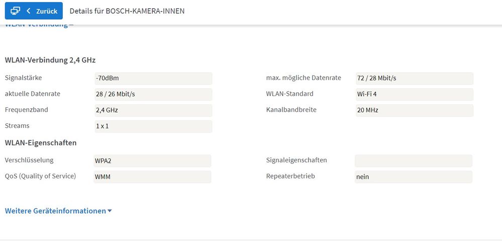 Das ist alles was in der Fritzbox steht. Ich habe noch 3 Aussenkameras. Bei denen steht unter Signaleigenschaften was drin...