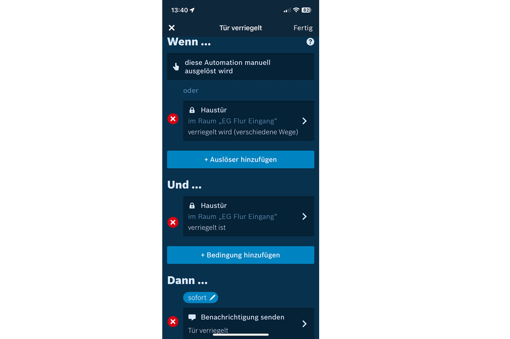 Screenshot: Szenario > Automation "Lock" via Bosch Smart App (Auto-Lock via Yale Smart Lock 2):