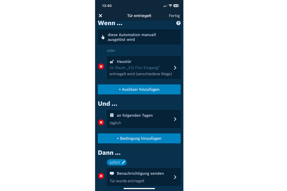 Screenshot: Szenario > Automation "Unlock" via Bosch Smart App (KEIN/NO Auto-Unlock via Yale Smart Lock 2 zu finden/to be found):
