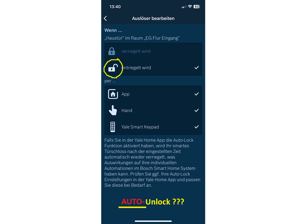 Sprich Bosch Smart Home App muss auf den Zustand Auto-Unlock (entriegeln) des Yale Smart Lock 2 reagieren: