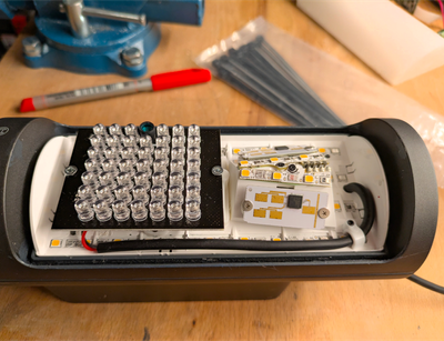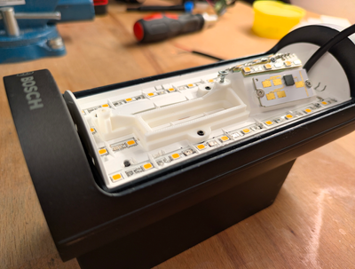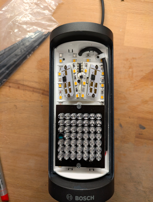 Als erstes habe ich daher alle kaltweißen LED's rausgelötet. Das war soweit problemlos. Im Bild leuchten die warmweißen LED's.