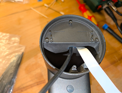 Um das Kabel ins Innere der Kamera zu bekommen habe ich am oberen Ende ein passendes Loch durch die Platine und das Kameragehäuse gebohrt. An dieser Stelle verlaufen keine Leiterbahnen in der Platine. Das Kabel kommt direkt neben dem Flachbandkabel heraus.