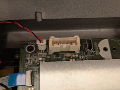Zunächst müssen vier Steckverbinder gelöst werden (1x verdrillte zweiadrige Leitung (Sirene?), 1x geschirmte Leitung (Lautsprecher?), 1x kleines Flachbandkabel für untere Ambientebeleuchtung, 1x großes Flachbandkabel für die Objektivbaugruppe (Kamera, Status-LED und Mikrofon).
