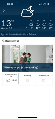 ich habe mein Connect Key gestern zum ersten Mal an meine Wärmepumpe angeschlossen und betrieben. Mir ist aber aufgefallen, dass bei der aktuellen Temperatur nichts angezeigt wird. Ist das normal ? Müsste dort nicht irgendwas angezeigt werden auch wenn 5-6-7 Grad wäre ?🙄 Außerdem beim Gerätestatus wird die Außentemperatur angezeigt (14,7*) aber Heizung, Warmwasser ist ausgeblendet..