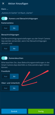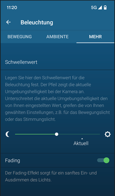Zusätzlich kann man über die (blaue) System-App noch das Licht der Außenkamera anschalten (z.B. über eine Automation). Diese Automation schaltet aber ausschließlich das "manuelle" Licht (nicht das Ambiente Licht).